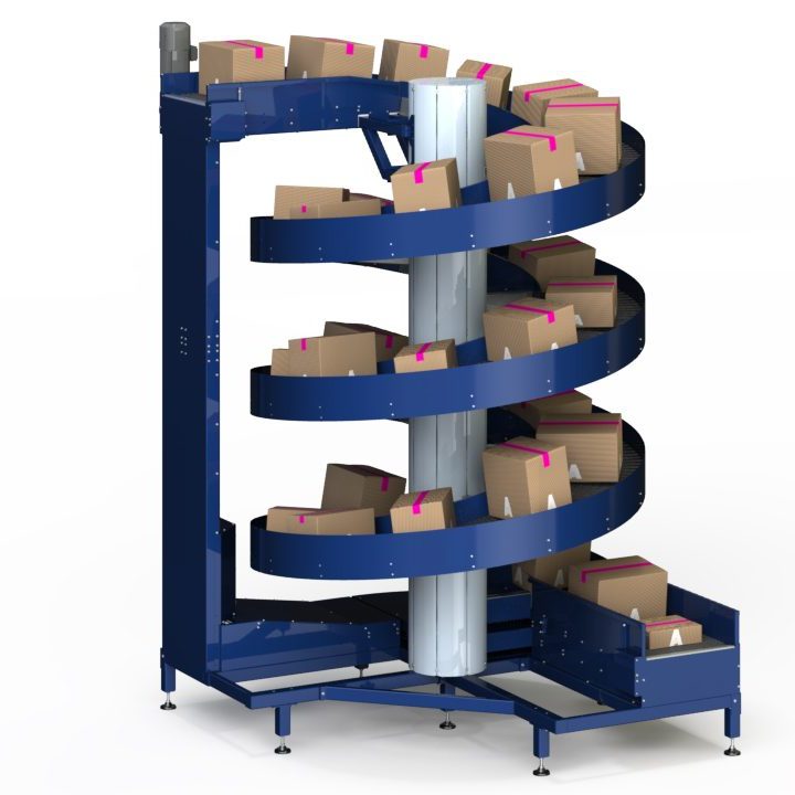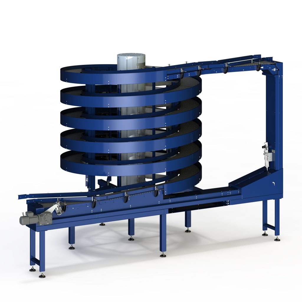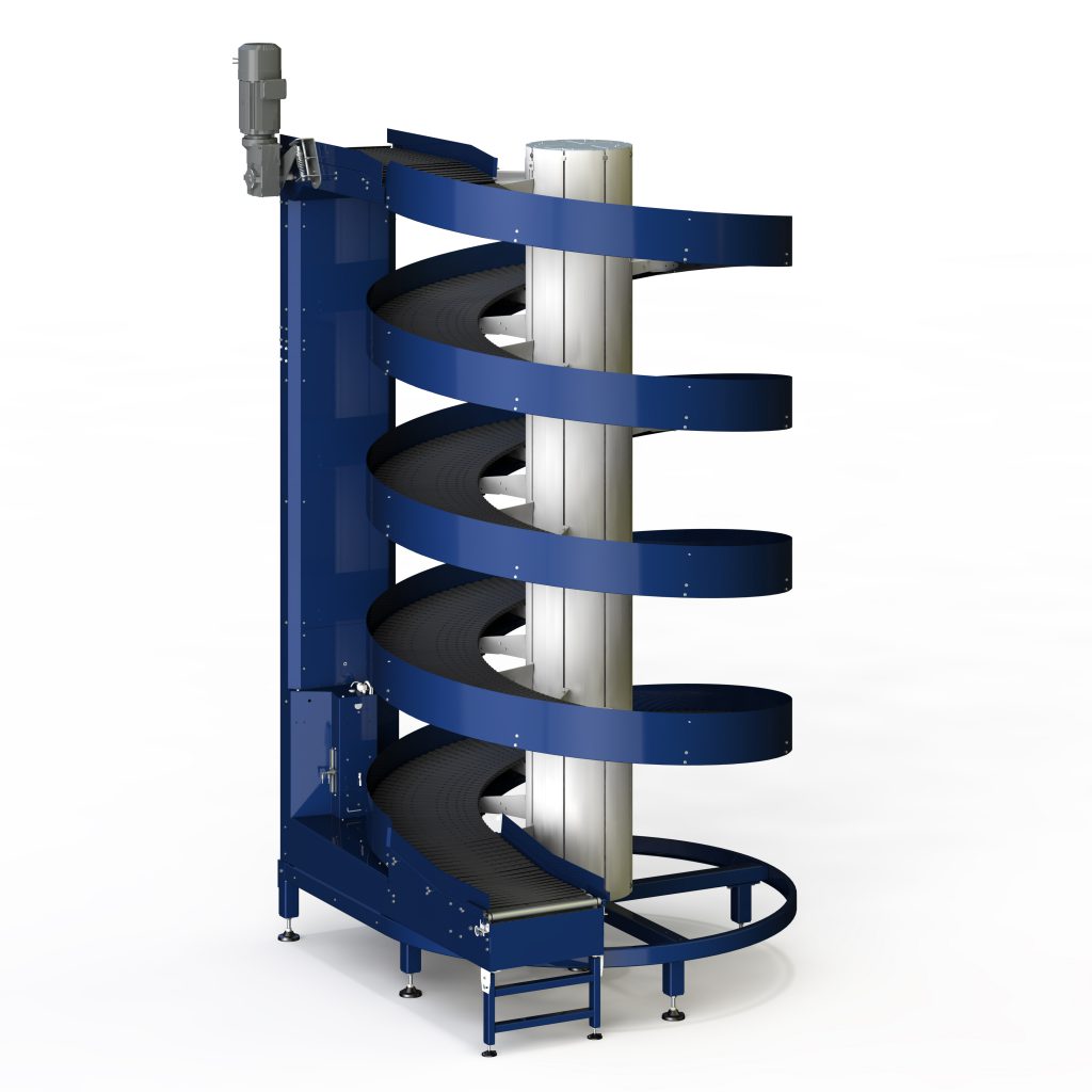 Equipo de transporte que permite mover materiales o productos verticalmente o en pendiente utilizando una banda o cadena que gira en forma de espiral alrededor de un eje central. Su diseño compacto permite transportar cargas entre diferentes niveles con un espacio reducido.