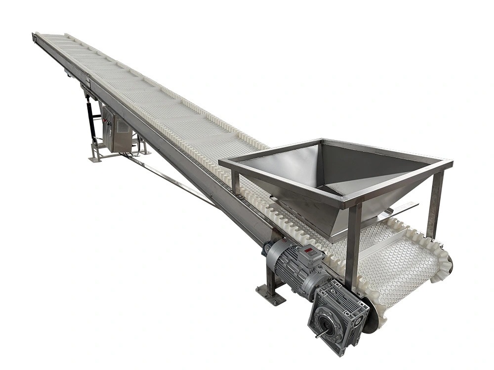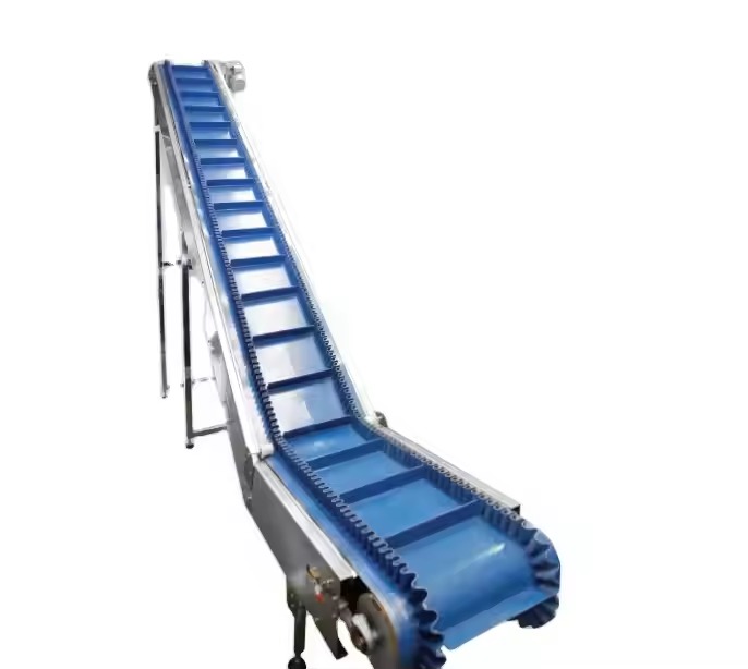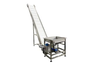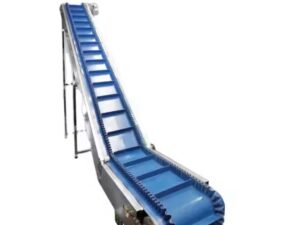 Sistema que utiliza una banda transportadora inclinada equipada con empujadores o tacos (también llamados flights o cleats) fijados en la superficie de la banda. Estos empujadores ayudan a elevar productos en pendientes pronunciadas evitando que se deslicen hacia abajo debido a la gravedad.