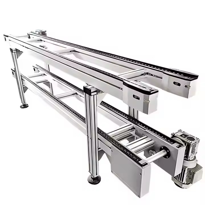 Sistema de transporte industrial que utiliza una o varias cadenas metálicas para mover cargas sobre una estructura rígida. Las cadenas actúan como el elemento principal que arrastra o soporta el material, especialmente útil para cargas pesadas o de formas irregulares.
